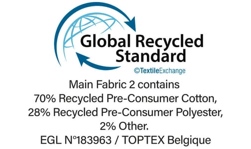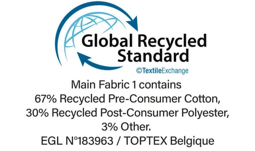 GRS-certificering (Global Recycled Standard), controleert het percentage gerecycled materiaal en garandeert de traceerbaarheid ervan van de bron tot het eindproduct. Gecertificeerd door Ecocert Greenlife.