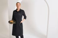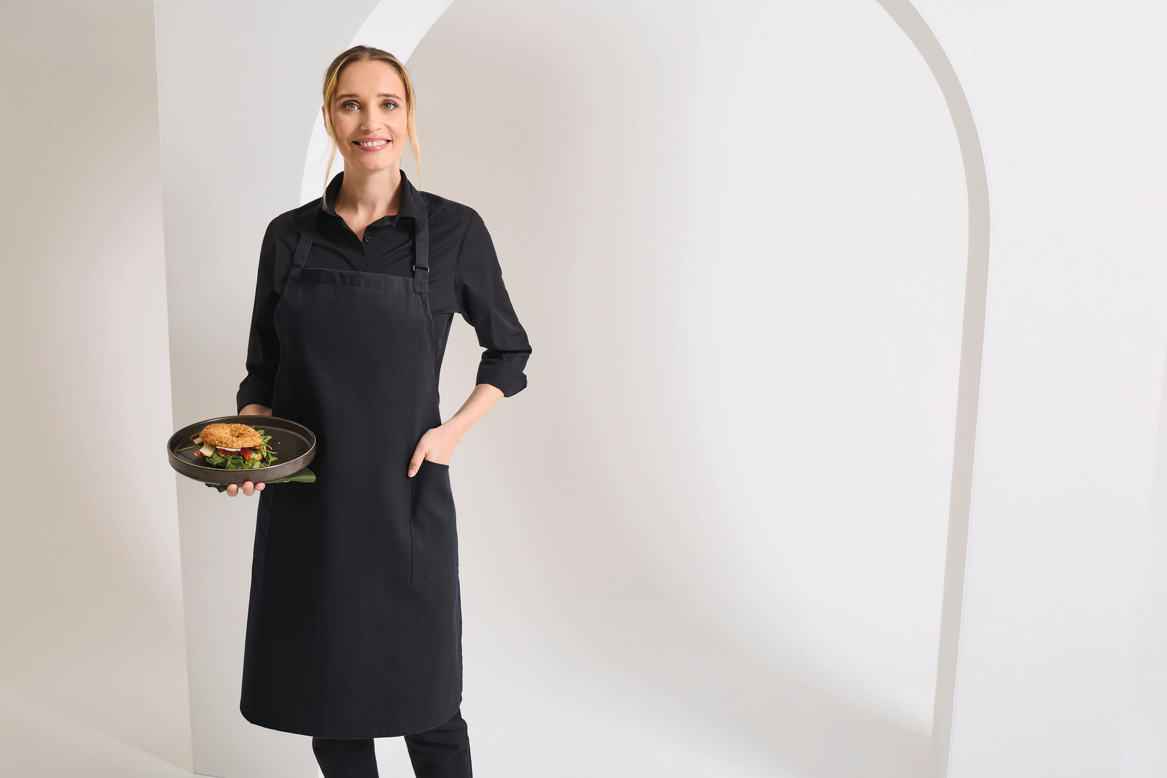 65% gerecycled polyester / 35% katoen. Twee schuine zijzakken. De lengte van het schort is aanpasbaar met een gesp aan de halsriem. Thuis wassen op 60 °C.