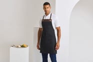 65% polyester / 35% katoen. De bovenkant van het schort is afgezet met imitatieleer met 2 grote oogjes waar de choker doorheen gaat. De choker kan aan beide kanten worden versteld met twee drukknopen. Centrale zak in het midden genaaid zodat er 2 zakken ontstaan.