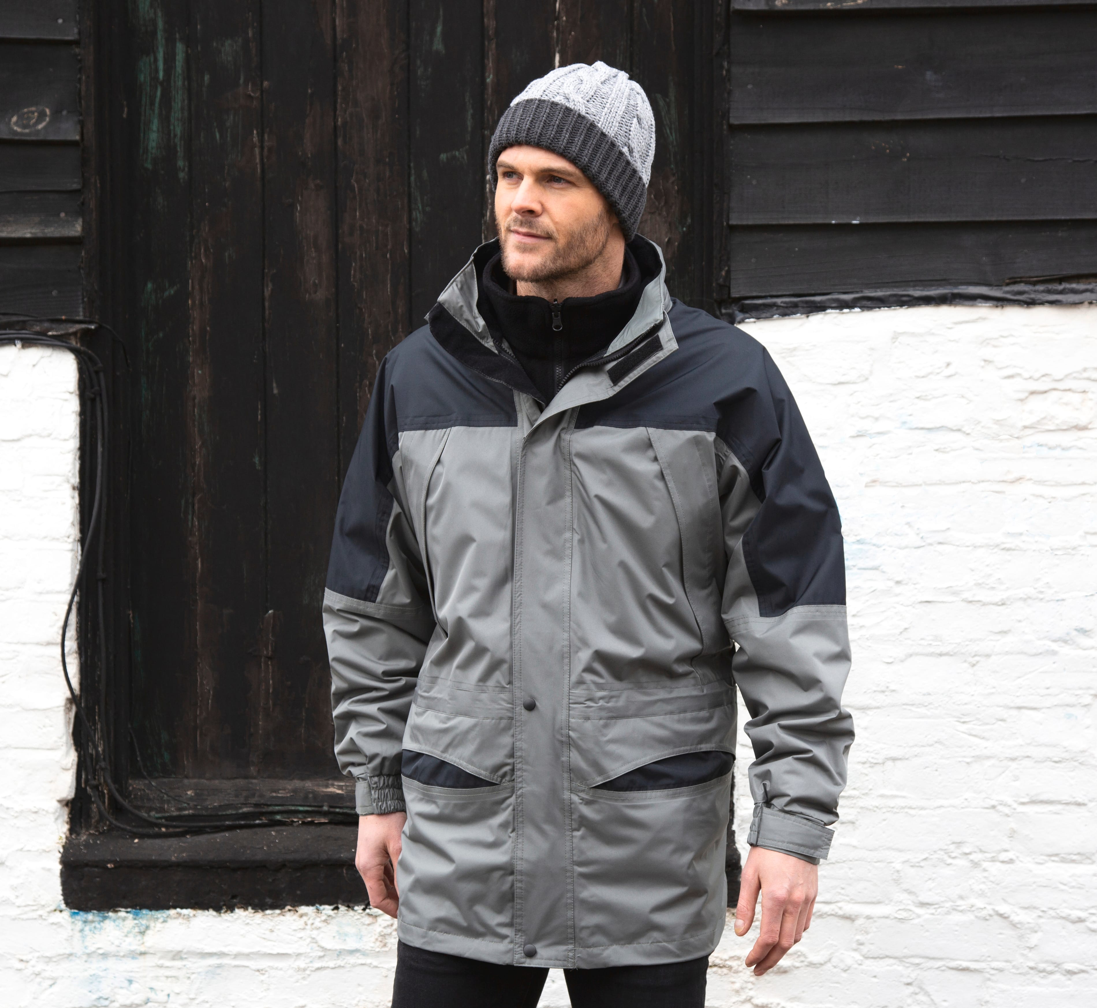 Buitenjas: StormDri 2000 polyester met PVC coating. Gewatteerd met 280gsm 100% Polyester Microfleece. Voering van 100% polyester microfleece. Waterdicht en winddicht. Getapete naden. Gevoerde capuchon in de kraag met aanrijgkoord. Rits om binnenjas aan buitenjas te verbinden. Volledige ritssluiting met stormoverslag met drukknopen. 2 ruime zij- en borstzakken, 1 borstzak aan de binnenkant + gsm zak en grote mesh zak. Lusjes voor de MP3 oortjes. Elastische mouwuiteinden met klittenband verstelbaar. Aanrijgkoord onderaan. Binnenjas: 100% anti-pilling polyester microfleece. 2 ruime voorzakken. Volledige ritssluiting. Aanrijgkoord onderaan.
